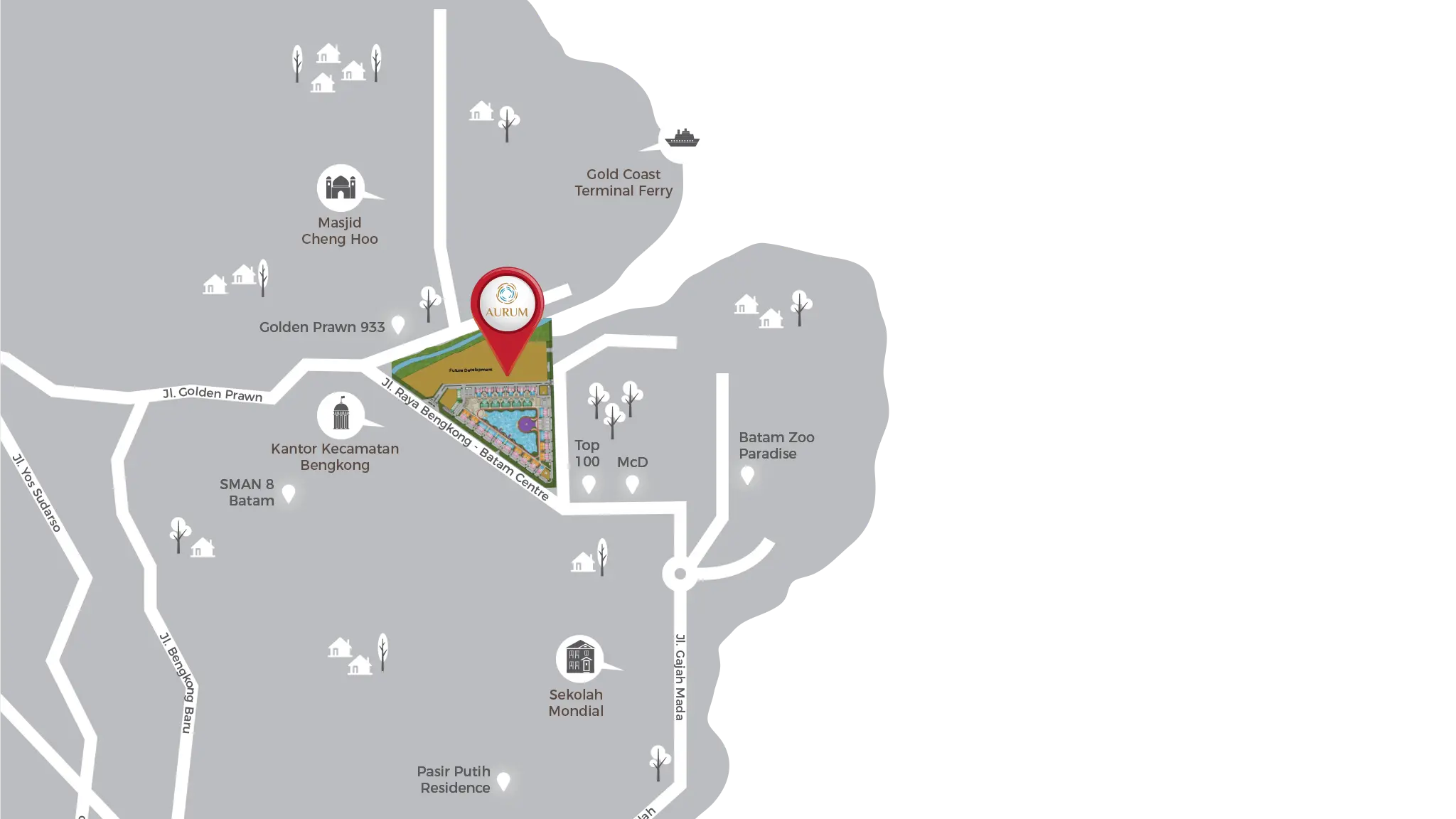 AURUM is located in Bengkong, Batam — just 5–15 minutes from international ferry terminals (Batam Centre, Harbour Bay, Gold Coast) and 20 minutes from Hang Nadim International Airport. Major malls, schools, and hospitals are all within a 10–15 minute radius.